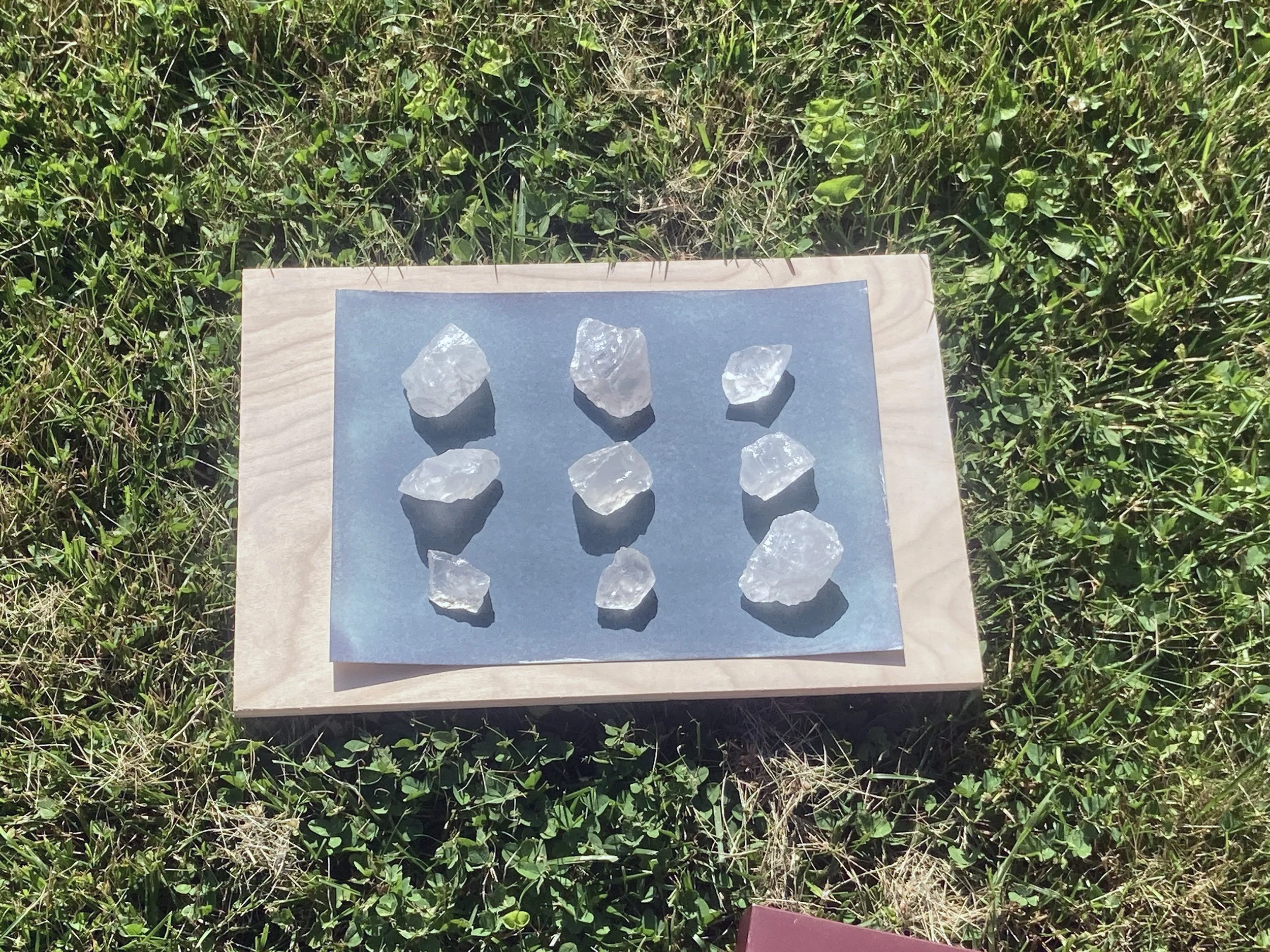 Sunday Puzzles on a Clūdy Day celebrates the mundane and the routine that keeps us grounded in the torrents of changes around us. The word "cloud" originated from Old English "clūd," or clumps of rocks. Clear quartz rocks were placed directly on top of cyanotype paper to capture their shadows.