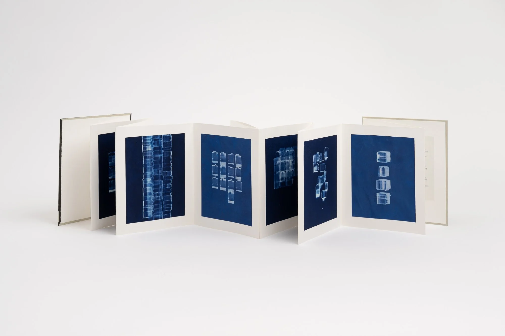 what we decided to forget by not writing it down (2024), cyanotypes on Hahnemühle sumi-e paper, mounted on Rives BFK paper with relief-printed Kitakata, 8” x 10” closed
